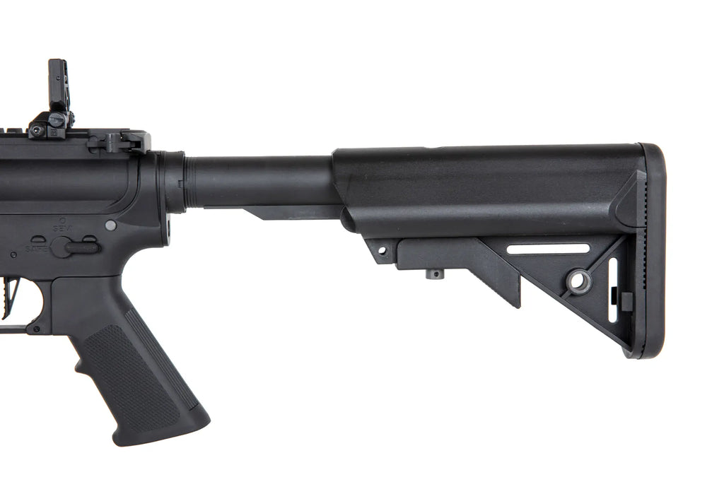 Hinter dem Getriebe verbergen sich 8-mm-Gleitlager und die abgestützten Stahlzahnräder. Das System wird durch vier Rücklaufsperrklinken gesichert. Der leichte Polycarbonat-Kolben ist für zusätzliche Festigkeit mit einer Vollstahlstange ausgestattet. Auch hier kommen ein Zylinder vom Typ 2 und ein Abschalthebel aus Stahl zum Einsatz, und die Festigkeit der Teile ermöglicht es, mit M140-Federn zu arbeiten.